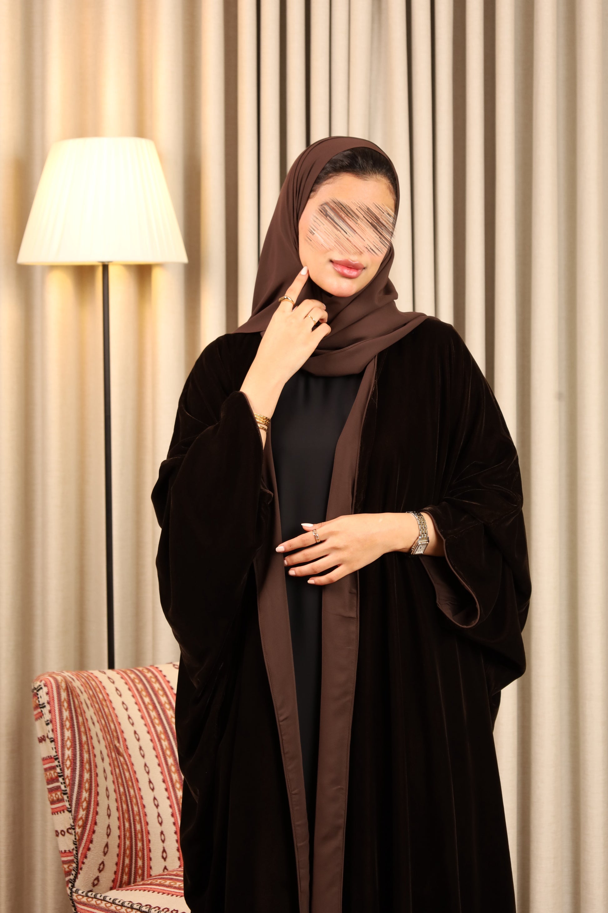 Velvet Winter Abaya with a half-bisht design, wide sleeves, and braid details for a chic, warm look
